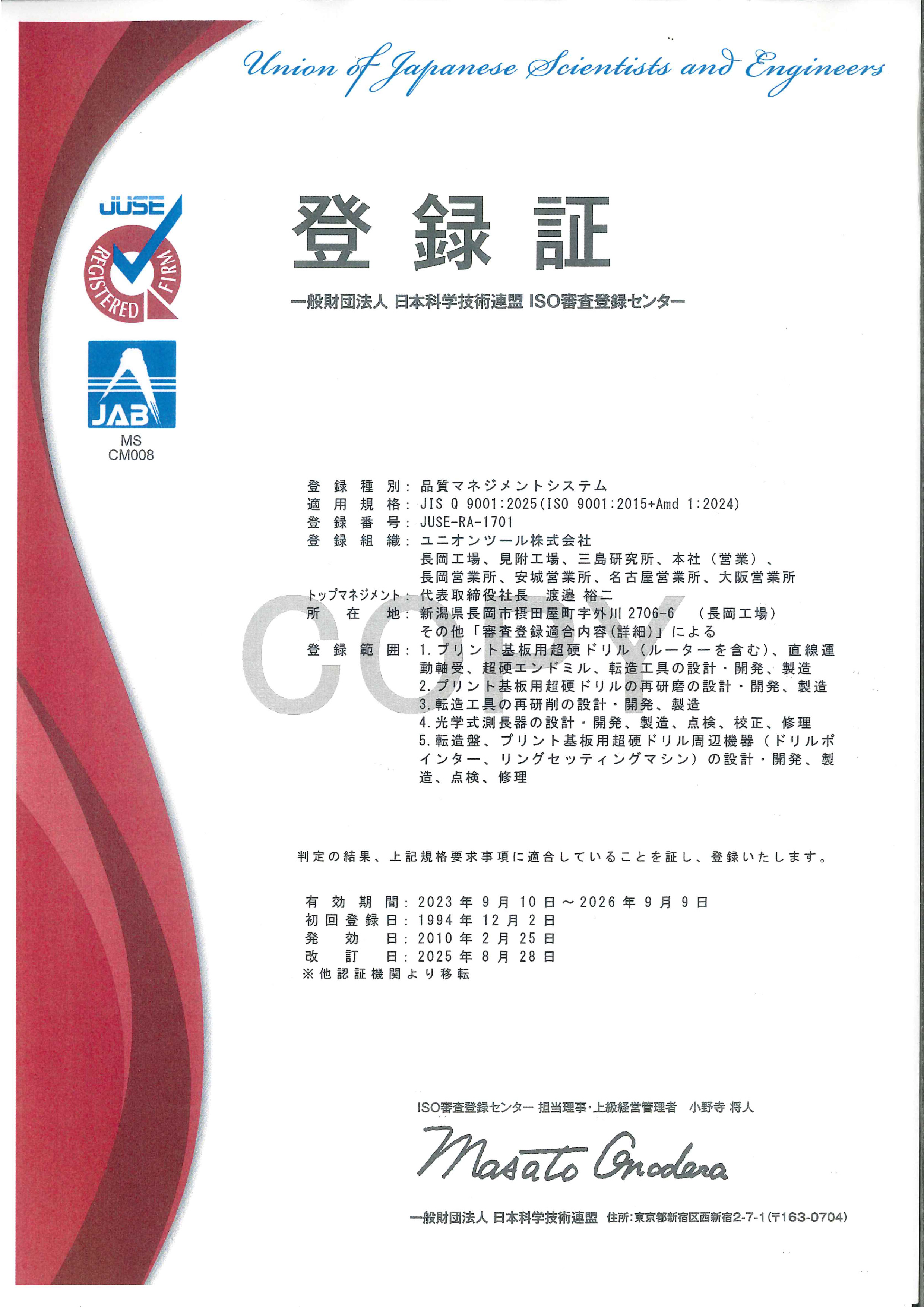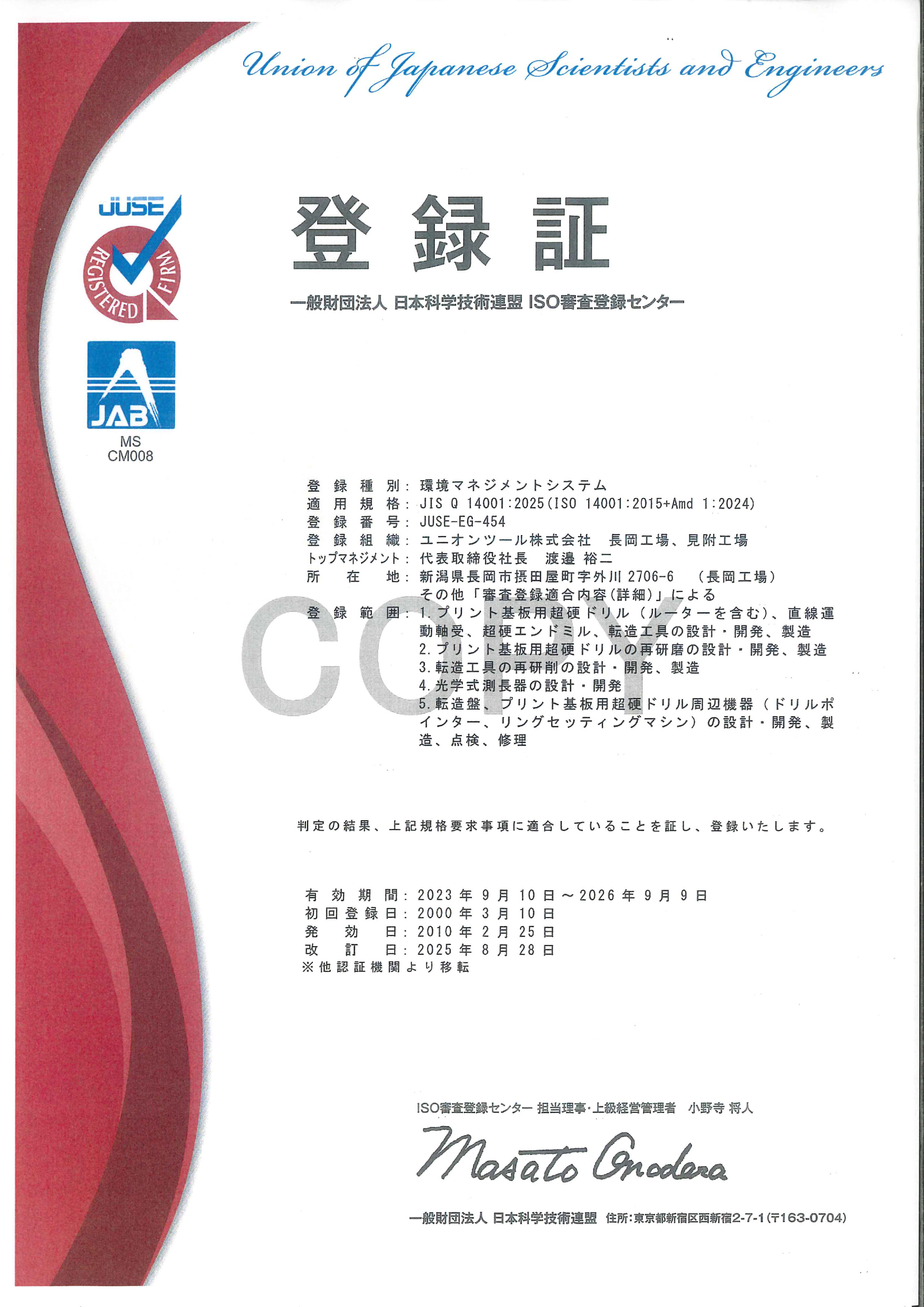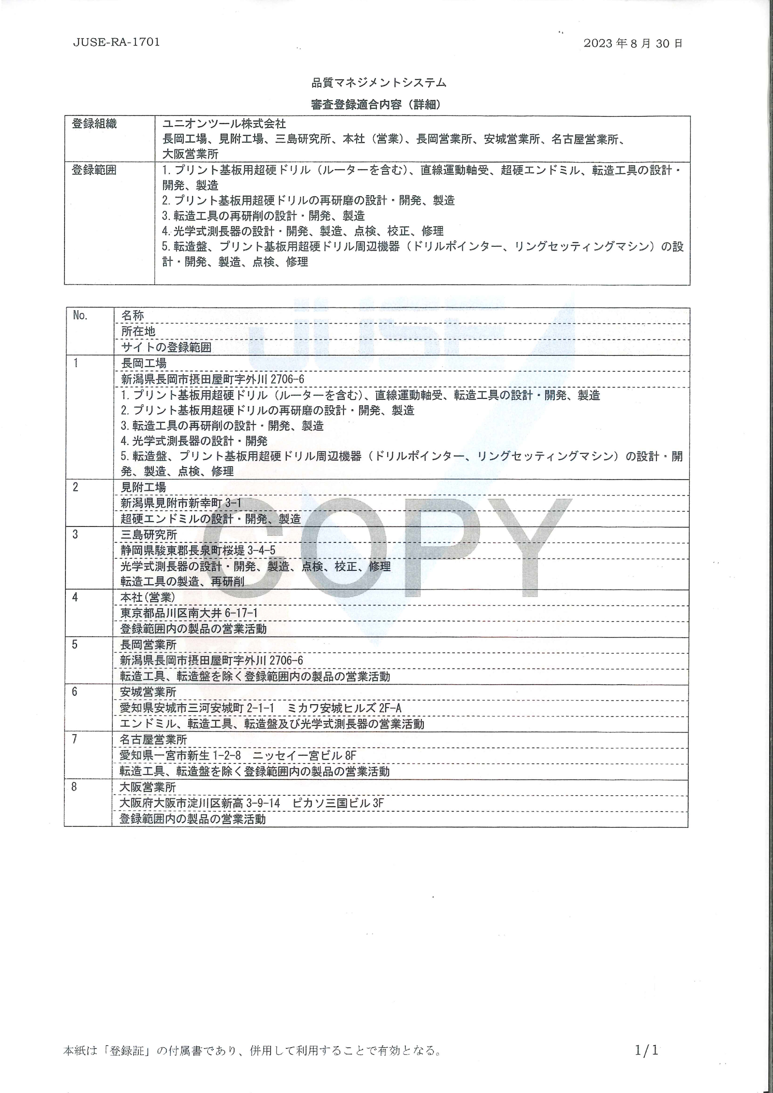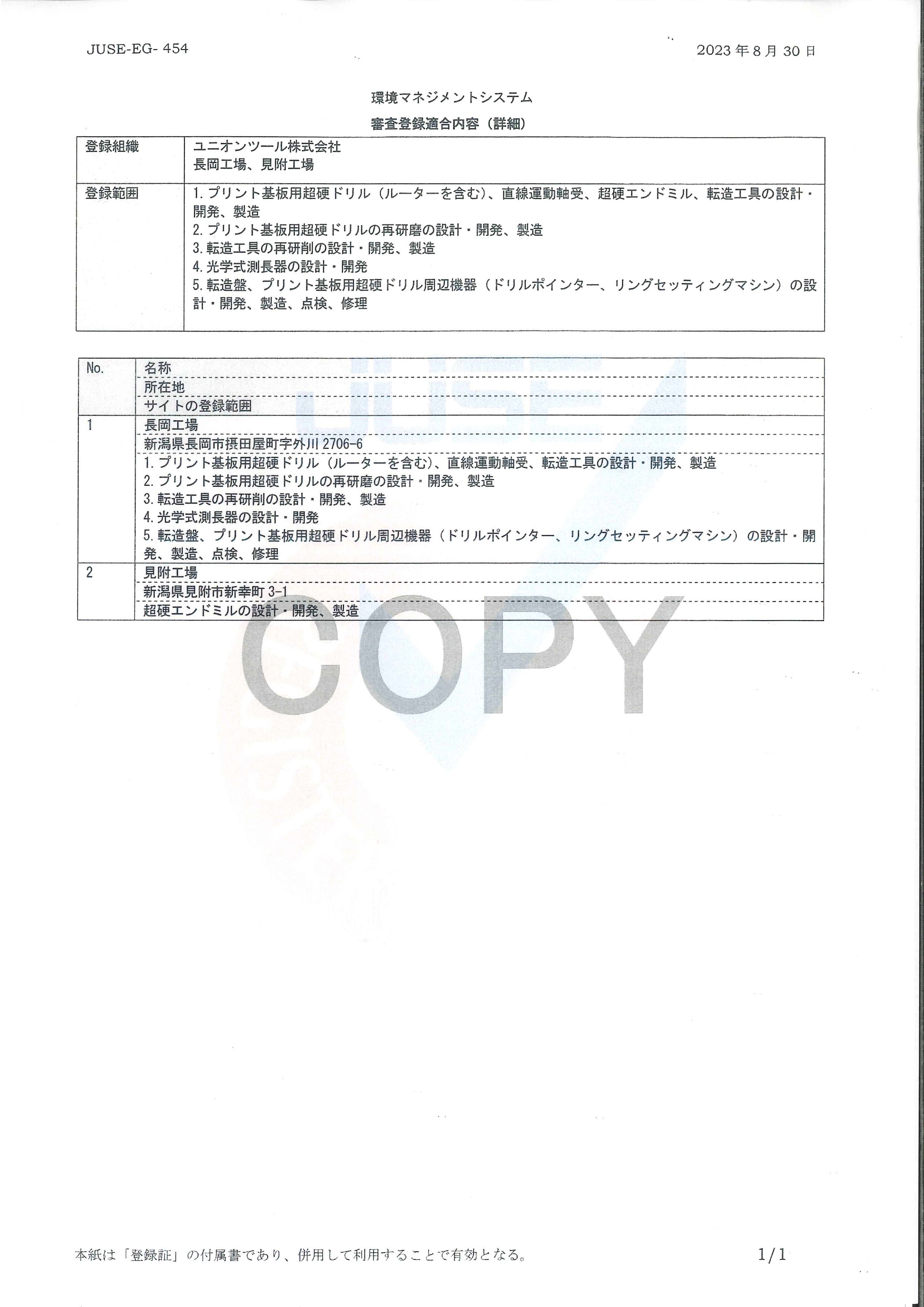 | 登録組織 | ユニオンツール株式会社 長岡工場、見附工場 |