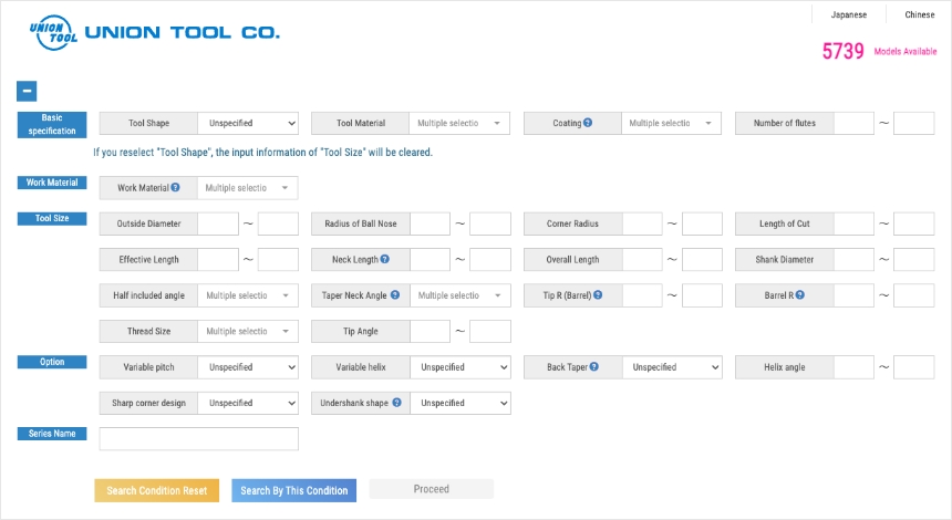 | Product Search | Users can search the products in many different ways, such as by tool shape, size, series name, material application, etc. |