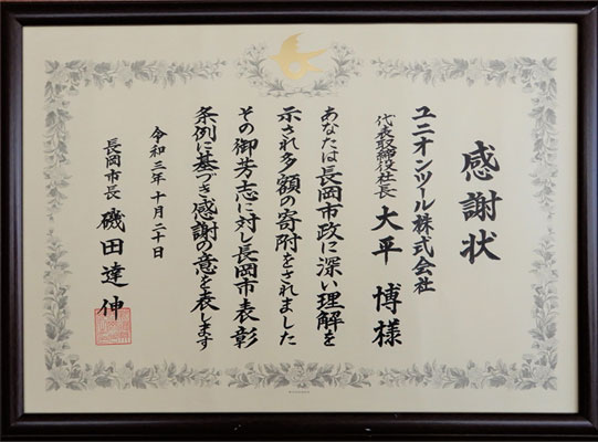 企業版ふるさと納税を活用した寄付により、長岡市の地方創生事業を支援したことに感謝の意を表され、長岡市長の磯田達伸氏より感謝状を贈呈されました。