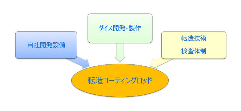 ワイヤーを使用していないことからワイヤレスバーとも呼ばれており、従来のワイヤーバーにはない特長を持っています。ワイヤーバーはワイヤーの太さを変更することで塗布量を変更していますが、UCロッドは溝形状を変更することでご希望の塗布量が得られます。この溝は自社製の高精度転造ダイスと長年培われた転造技術によって、ロッドへ均一に加工されます。
