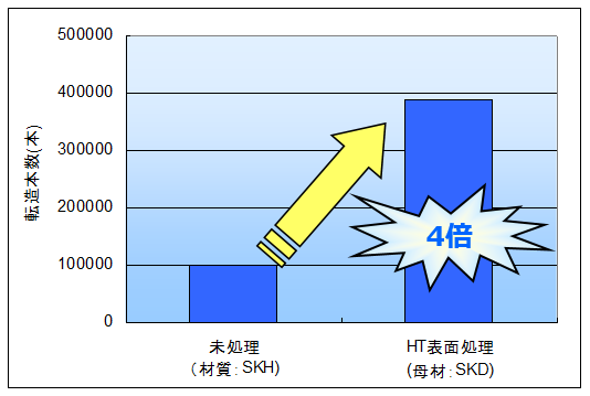 HT表面処理を施すことにより、工具表面硬度を大幅に高め、従来の転造ダイスと比べ工具寿命を改善する事が可能です。母材はSKHより安価なSKDを用いることで、価格を抑えることが可能です。従来と同等なコストで長寿命を得ることができます。(SKHへの処理も可能です)