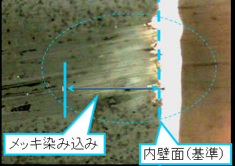 メッキ液が絶縁層のガラス繊維に沿って染み込む現象のことを言います。ウィッキングとも呼ばれています。