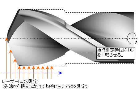 摩耗したドリルの外周直径を測定します。測定は非接触レーザー測定機を用い、以下の原理で測定します。