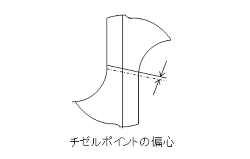 ドリルは基板に食い付いた後、多少歩きの現象を起こすが、ほぼチゼルポイントを中心に回転しながら穴加工する。このためチゼルポイントが偏心している場合、チゼルポイントから外周までの距離の長い方を半径として回転するため、穴径が拡大する。