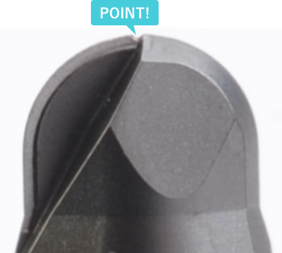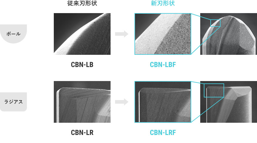 超仕上げ加工用ロングネックボール CBN-LBSF、ロングネックラジアスCBN-RSFは、バニシング効果を持たせた特徴的な刃形状により、従来品より更に良好な仕上げ面を得ることができます。