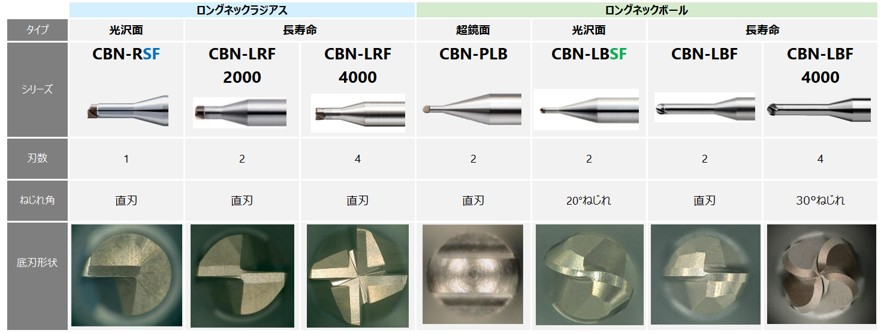 CBNシリーズに超鏡面加工用ロングネックボールCBN-PLBを新たに追加。独自の先端形状により、バニシング効果を最大限に引き出し、従来品以上の超鏡面加工が可能に!刃先までクーラントが届く溝設計により、切りくず排出性能向上、噛み込み防止の効果で、長時間鏡面性が維持されます。