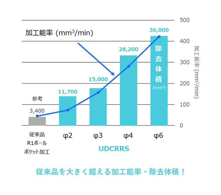 UDC-Hシリーズは、Fシリーズとは異なる刃先処理、改良型のダイヤモンド皮膜で、超硬合金の直彫りとは思えないほどの高送り加工を実現し、除去体積を格段にアップさせる、荒加工から中仕上げに最適な、待望のUDC第3世代シリーズです。