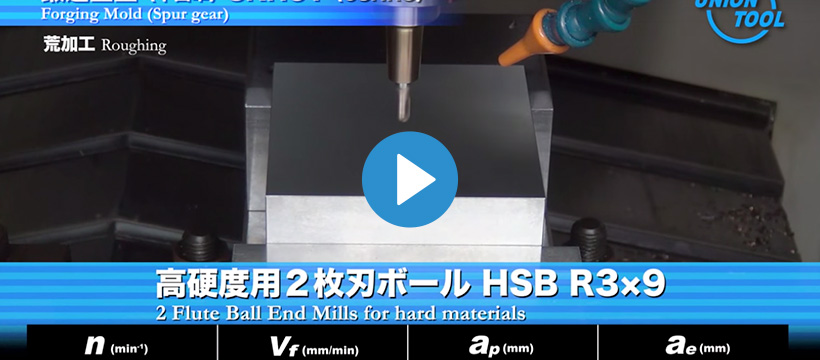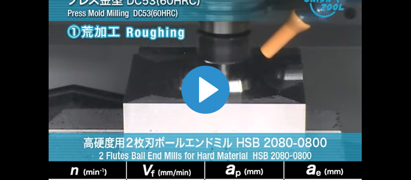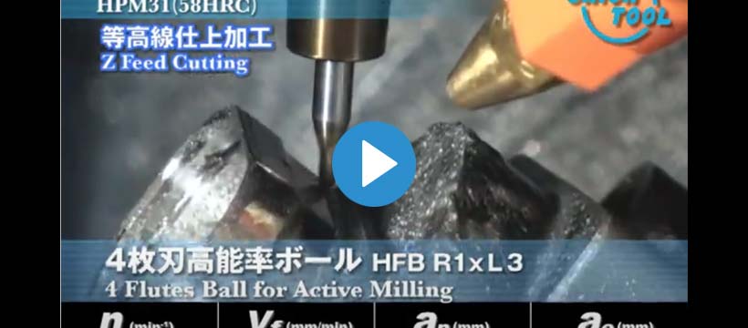 特殊先端形状により切りくずの排出性を最大限まで高めた高能率4枚刃ボールエンドミルHFBと高硬度用HARDMAXコーティングを施した2枚刃ボールエンドミルHSBを使用した5軸仕上げ加工動画!