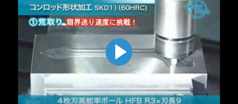 4枚刃高能率ボールエンドミルHFBによるSKD11(60HRC)コンロッド形状加工動画! 驚異の限界送り速度10000mm/minに挑戦!また先端溝形状により底面のミガキレス加工も実現!