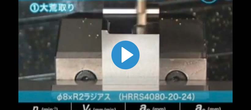4枚刃高能率ロングネックラジアスHRRSによるDH31S(52HRC)の荒加工動画! シームレスコーナーR形状により、切削抵抗の低減とビビリを抑制。驚異の高送りを実現します。