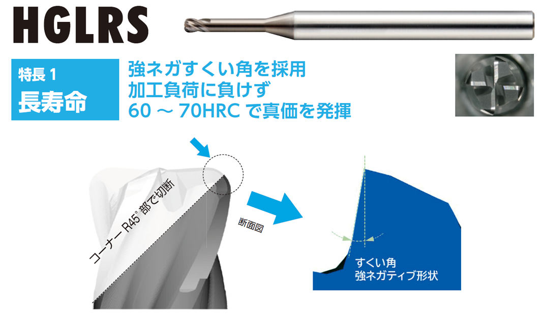 弊社では、様々なエンドミル・ドリルを揃えていますが、その中で私がこだわりを持って販売している製品が高硬度材用エンドミルHMGシリーズです。私たち営業の重要な役割は、「いかにお客様の要望に適した工具をご提供できるか」です。日々の営業活動の中で、お客様から「高硬度材の加工でもう少し寿命が長い工具が欲しい」「もっと高精度に加工したい」「加工面粗さを改善したい」というご要望をいただきました。これらのお客様から頂いたご要望、課題を技術部門にフィードバックし、開発に取り組んだ結果生まれたのがHMGシリーズです。HMGシリーズの秘密は、従来コートより耐摩耗性に優れている新コートの採用、その新コートを活かす新母材の適用、製造工程の能力を向上させたことによる高い外径精度・R精度です。これによりHMGシリーズは従来品より寿命摩耗量を30%も下げ、工具寿命、高精度加工、加工面粗さを大幅に改善した製品となりました。今後もお客様から頂いたご要望、課題に対して「営業」が伝え、「技術」「製造」が実現するという三位一体の取り組みを続けることで、今以上にお役に立つ工具をご提案、ご提供したいと考えています。お困りの際にはぜひユニオンツールにお声がけをお願いいたします。