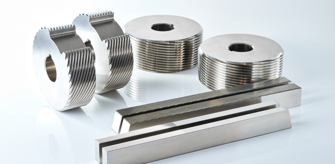 歯車を製造する工具です。切削工具とは違い、転造という対象加工物に圧力を加えて変形させるという加工方法をとります。使用する際は複数のダイスを用いて棒状の素材を回転させながら圧力を加えて加工します。製造されたねじなどは機械の部品などに用いられます。