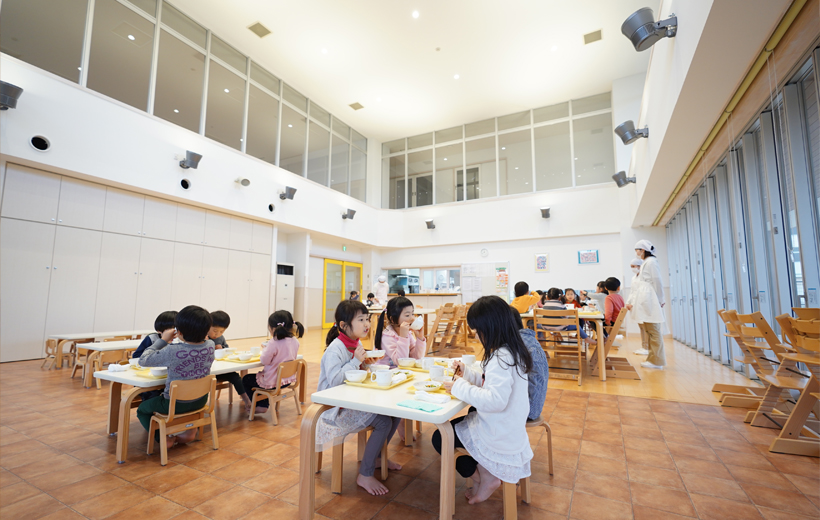 開放的で吹き抜けの1階ランチルーム、施設の南側は全面ガラス張りで太陽の光が園内に降り注ぎます。