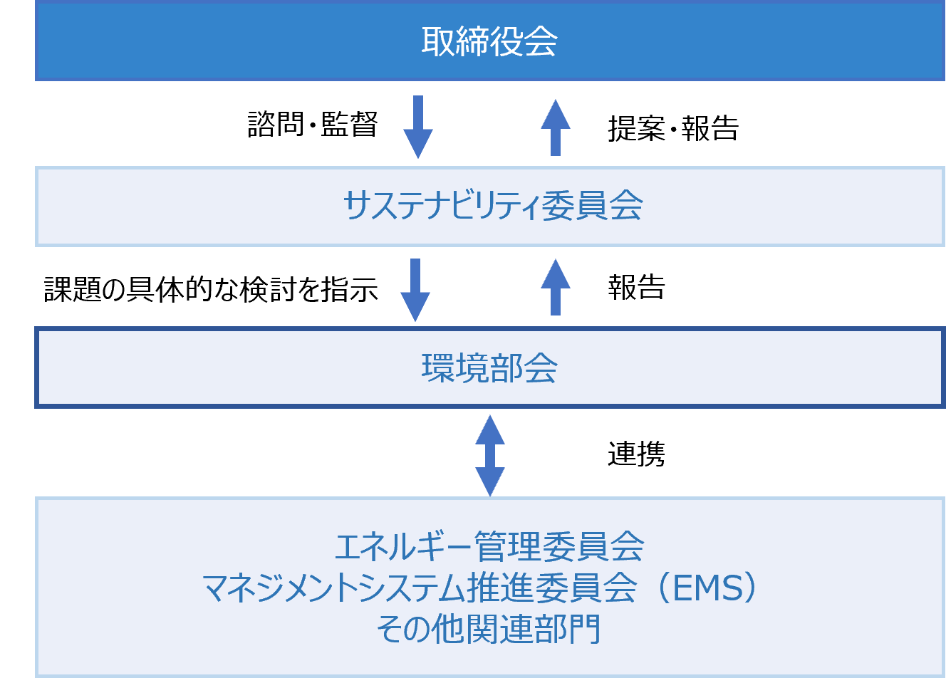 本委員会は取締役会に直属しており、基本方針の改訂やサステナビリティ課題の収集・評価を行うほか、諸施策の立案、実施の指示・監督などを担当し、結果を取締役会に提案、報告します。また、下部組織に環境部会を設置しています。